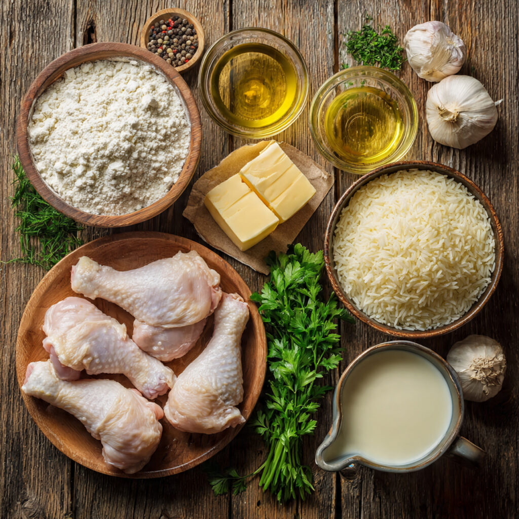 Pat the chicken dry and season with salt and pepper. Dredge each piece lightly in flour until evenly coated. Chop the onion, mince the garlic, and have the broth and cream ready.