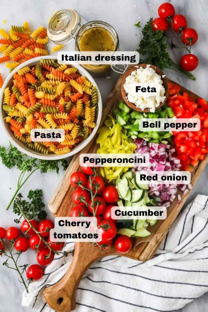 While the pasta cools, chop the vegetables into small, even pieces. Slice the olives and cube the cheese so everything is ready to mix. Keep the ingredients similar in size for a balanced bite in every forkful.