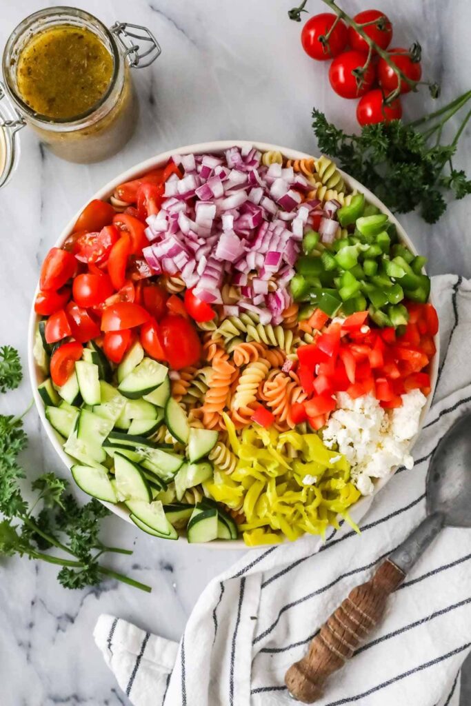 - Add pasta, vegetables, olives, and cheese to a large bowl.