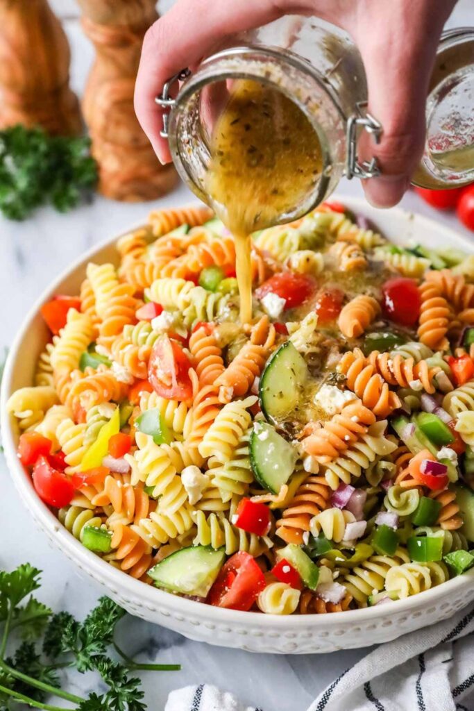 Tip: Use short pasta like rotini or bow tie so the dressing clings well.